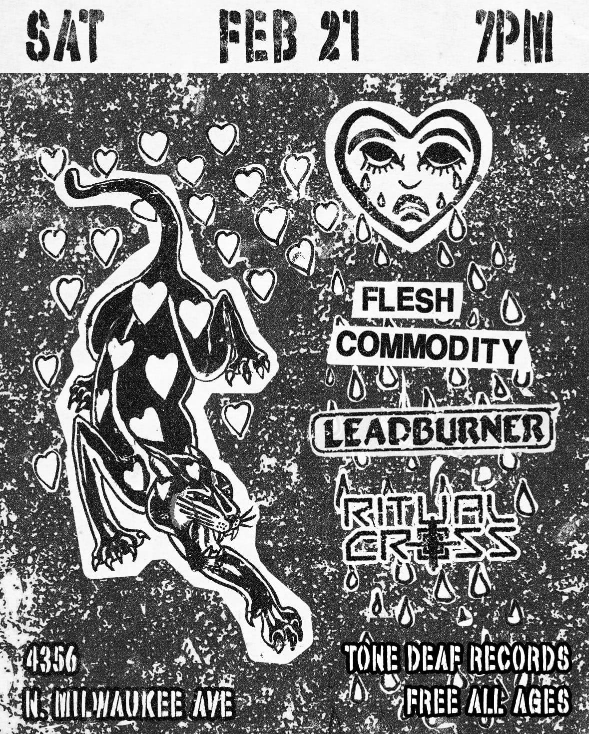If you're local to Chicago, we're playing a show on Saturday, February 21 at Tone Deaf Records with Flesh Commodity and Leadburner and you can buy tapes and shirts there if you're so inclined. And, what do you know, here's a cool flyer for that show!